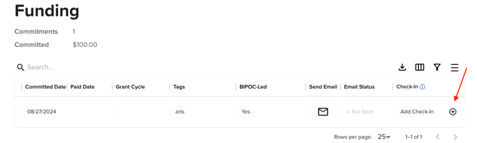 Done: The check-in has been completed. “Done” is indicated in the funding table if a funder manually marks it done or notes/attachments are uploaded to check-in notes.